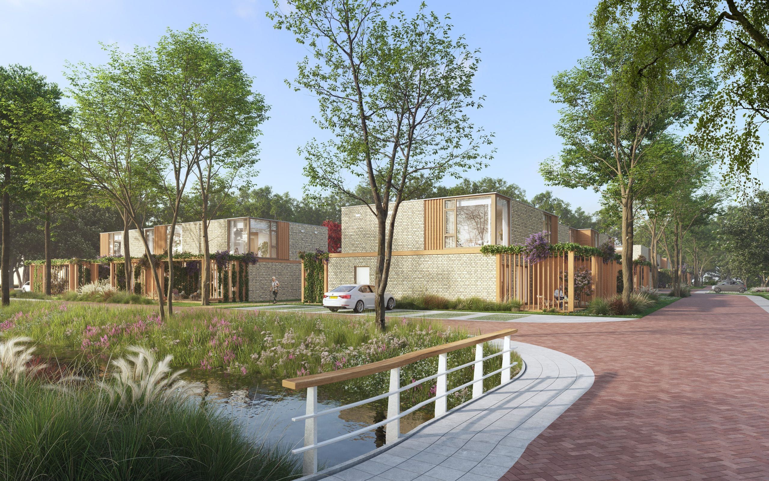 In Hof Driekamp woont u samen met de natuur. We richten uw woonplek zo klimaatadaptief mogelijk in. Door ruimte te maken voor groene binnentuinen en mooie bosranden rondom de woningen, voorkomen en minimaliseren we hittestress en creëren we koelspots. De wadi’s in de binnentuin zorgen naast opvang van overtollig regenwater ook voor verkoeling. Bovendien trakteert de rijke, natuurlijke, inheemse beplanting u ieder jaargetijde op een verrassende bloemenpracht.